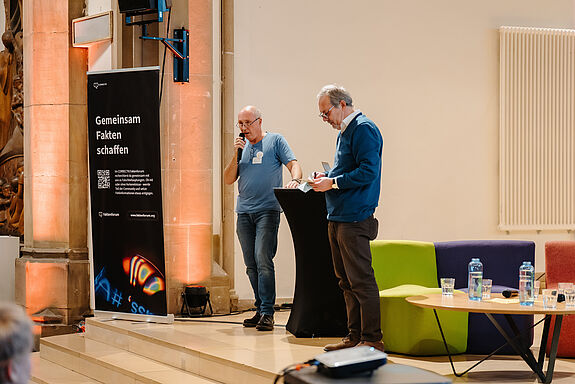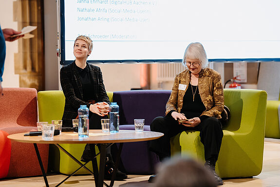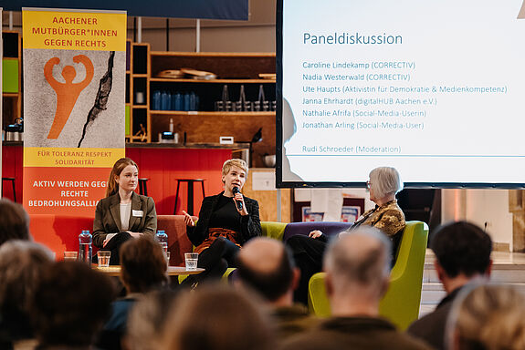 Nach einer kurzen Begrüßung durch die Gastgeber startete eine rund einstündige Paneldiskussion. Auf dem Podium sprachen Caroline Lindekamp (CORRECTIV), Ute Haupts (Aktivistin für Demokratie & Medienkompetenz), Janna Ehrhardt (digitalHUB Aachen e.V.) sowie die jungen Social-Media-User Jonathan Arling und Nathalie Afrifa. Moderiert wurde die Diskussion von Rudolf Schroeder. Im Mittelpunkt standen die Rolle sozialer Medien, der Umgang mit Falschinformationen und die Bedeutung digitaler Bildung.