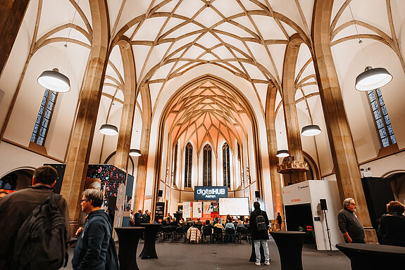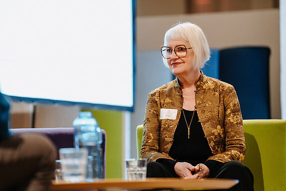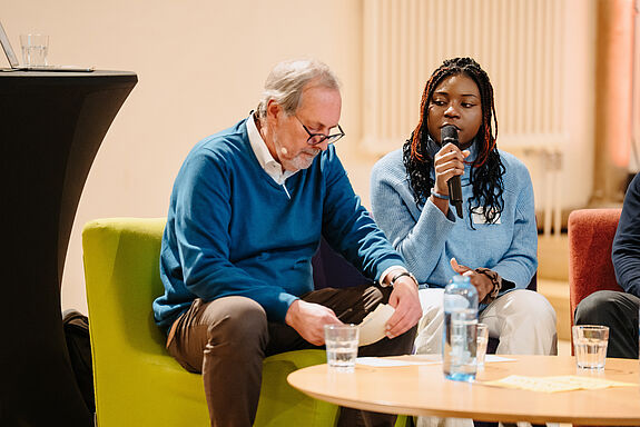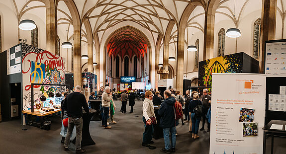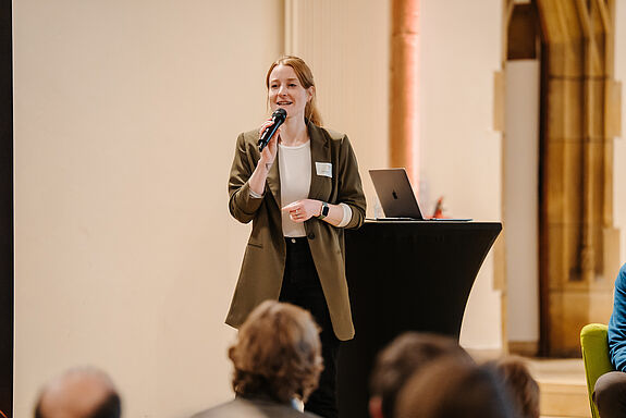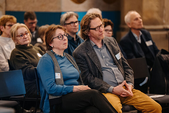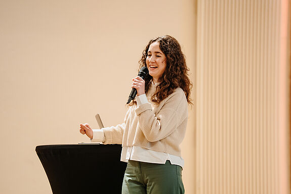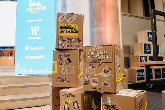 Interaktive Slido-Abfragen begleiteten die Veranstaltung, an denen die Besucher:innen per Smartphone teilnahmen. Die Ergebnisse wurden live projiziert und gaben spannende Einblicke in die Einschätzungen des Publikums. Für die visuelle Dokumentation sorgte Designerin Friederike Dietz mit einem fortlaufenden Graphic Recording. Die entstandenen Illustrationen wurden auf Sitzkartons präsentiert.
