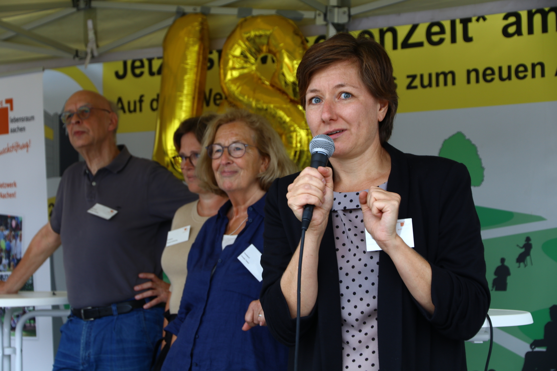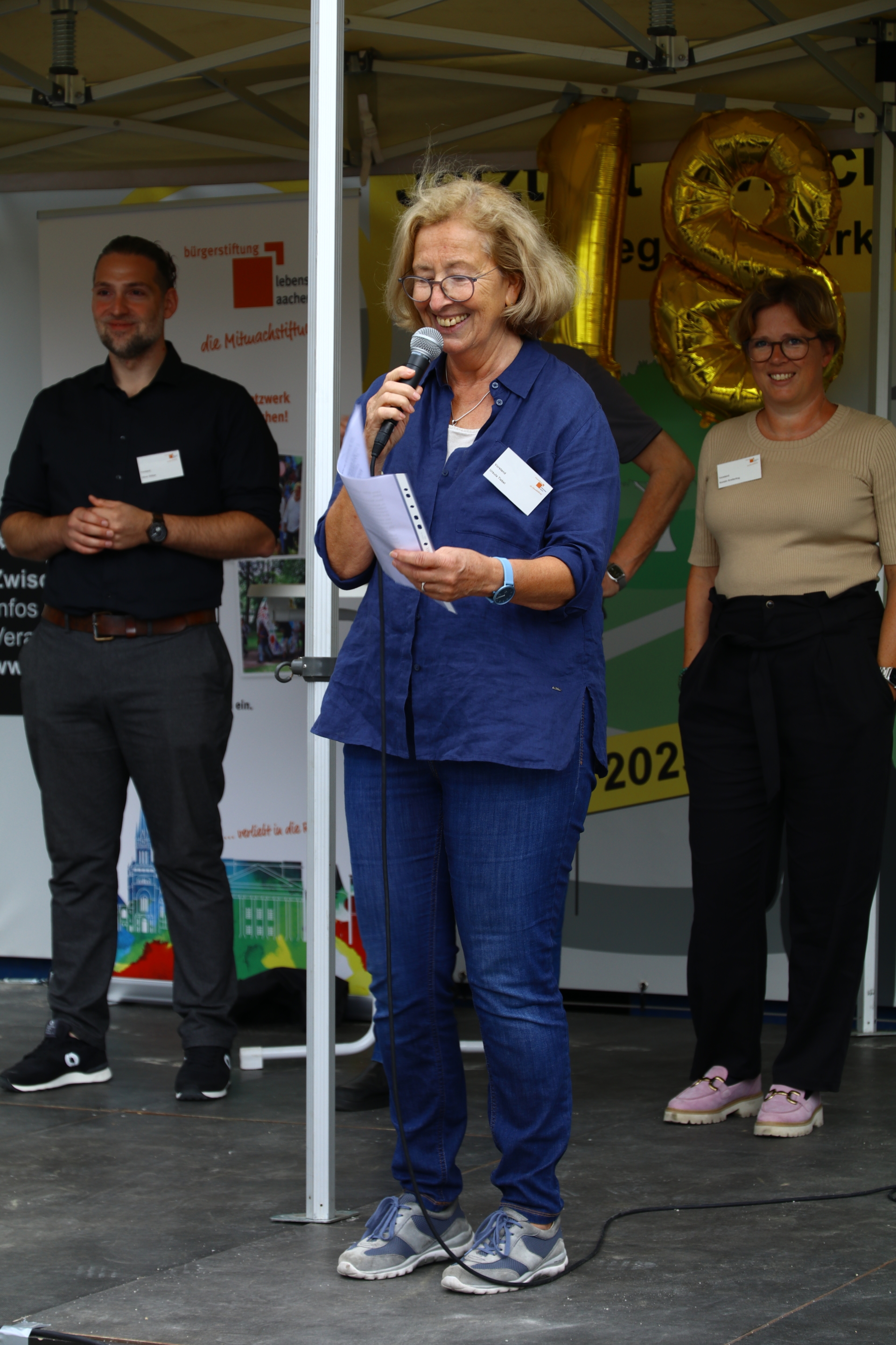Nach einem musikalischen Impuls des ukrainischen Chors „Paragraf 24“ unter der Leitung von Oksana Bogdan, hieß Ursula Tiebel im Namen des Vorstands die Gäste, Ehrenamtlichen und Stifter:innen herzlich willkommen. Hilde Scheidt gratulierte der Bürgerstiftung im Namen der Oberbürgermeisterin Sibylle Keupen herzlich zum Geburstag und auch die Improvisationstheatergruppe „Fliegender Wechsel“ stimmte die Gäste mit „Happy Birthday to you…“ein.