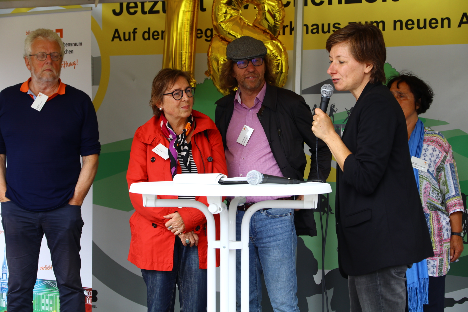 In einem kurzweiligen Podiumsgespräch kamen Ehrenamtliche und Gründungsstifter:innen der Bürgerstiftung zu Wort. Als ein Regenschauer auf den Platz niederprasselte, spannten sich viele bunte Regenschirme auf – der fröhlichen Stimmung tat dies keinen Abbruch. Ukrainische Lieder und interaktives Improvisationstheater sorgten für gute Unterhaltung.