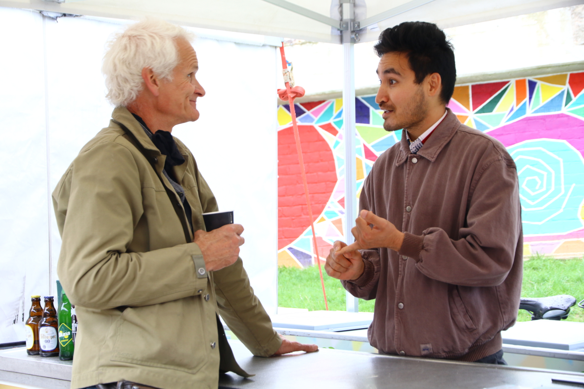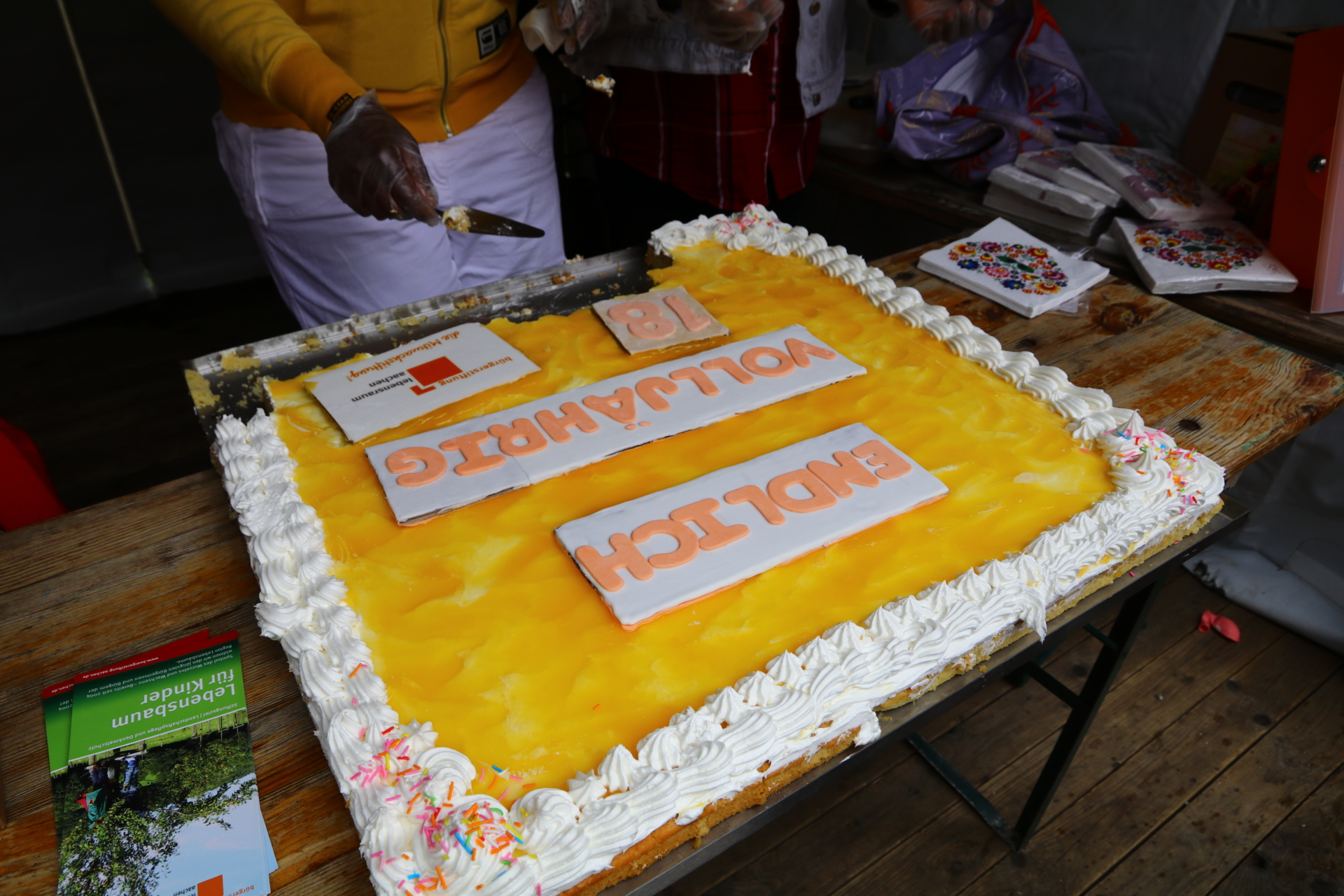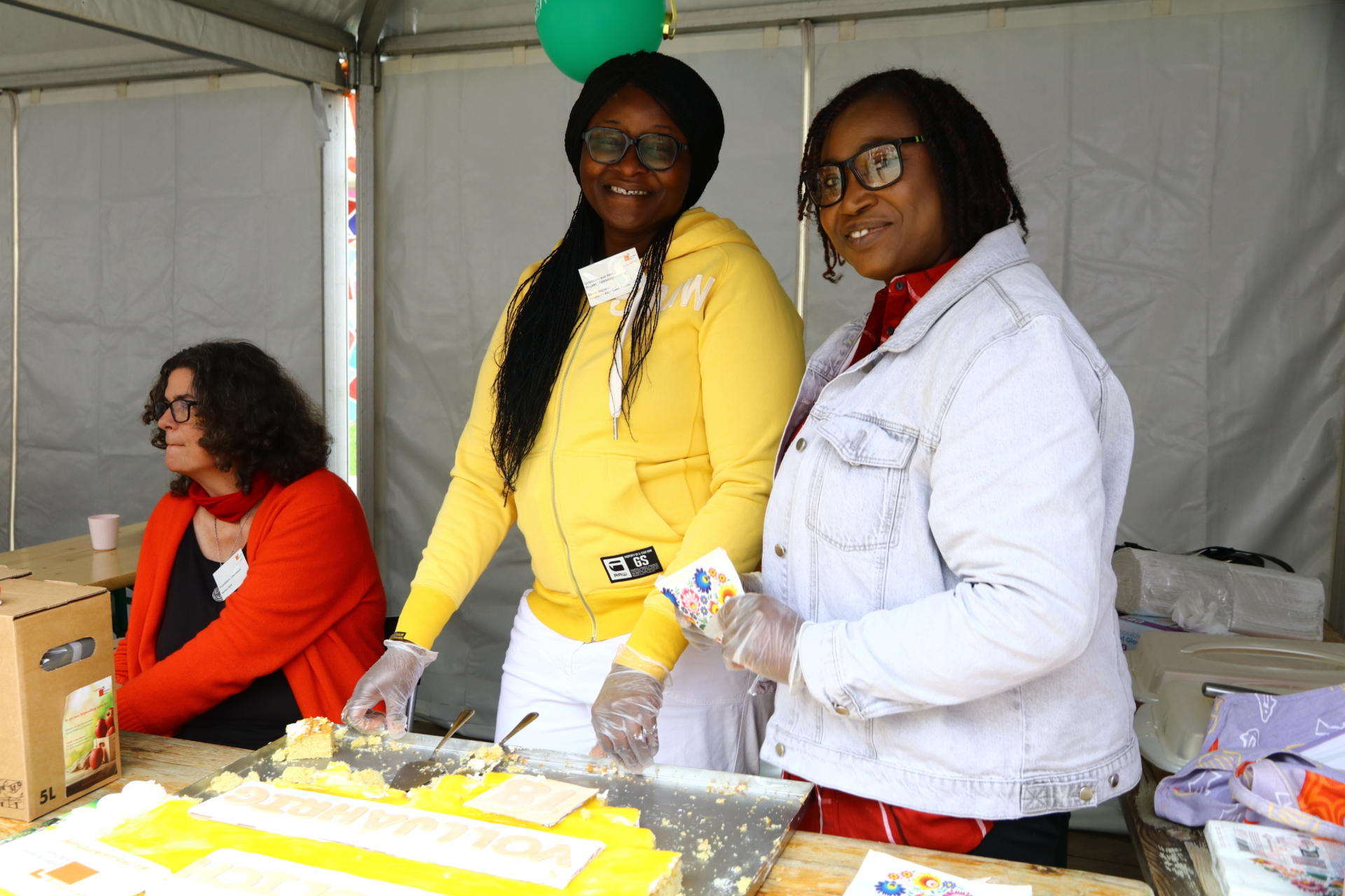 Kalte Getränke, Apfelsaft von den Lebensbaumwiesen, Kaffee und nicht zuletzt ein köstlicher Zitronenkuchen mit der Aufschrift „Endlich volljährig!“, gebacken von Ebere – Gründerin aus dem Projekt „Existenzgründung für Geflüchtete“ – sorgten trotz wechselhaftem Wetter für zufriedene Gesichter.
